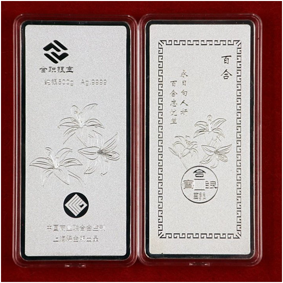 1000克储值型投资银条——“合联银宝”的规格为138×63毫米,正面图案:中间由盛开的莲花和花苞组成,上方为“合联银宝”商标及字样、银条的重量、成色,下方为中国商业联合会会徽、“中国商业联合会监制”和“上海稀金所出品”字样;背面图案:右上方有“莲花”字样,左侧为“出淤泥而不染,濯清涟而不妖”字样。下方为一个外圆内方的图形,里面嵌有“合联银宝”繁体字样,上方缀以盛开的莲花。