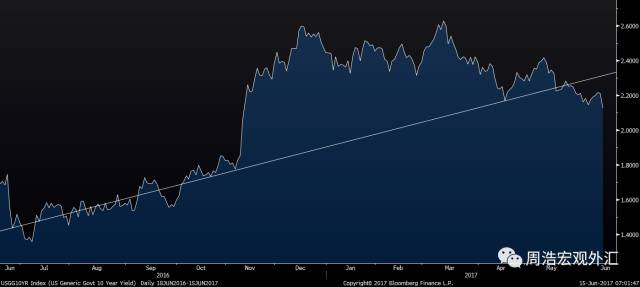 在今晨的美联储利率决议后,美国10年国债收益率定格在2.12%,而在特朗普当选之后的一个星期,美国国债收益率从不到1.8%的水平迅速攀升至2.26%,引发了一轮全球性的再通胀热潮。而现在,美联储从善如流地加息三次,甚至未来还预期至少四次(到2018年年底)的加息,缩表计划也开始按部就班地进行。然而,债券市场却给予了完全相反的反应。此外,比如LIBOR这样的短期利率却还在上升,这带来了一个让人惊奇的利率曲线扁平的状况。