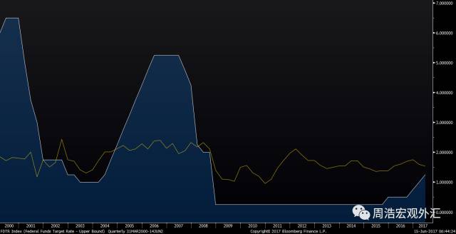第二,全球的通胀表现的确让人有些难以恭维。美联储利率决议前,美国的CPI数据显著低于预期,这已经让债券市场热情高涨。事实上,美国仍然无法达到2%的通胀目标,在未来一段时间内甚至也难以达到,这成为美联储最为头疼的问题。上图中的黄线是美国的核心PCE通胀率,白线为美国基准利率,在今晨的加息后,两者之差已经为金融危机以来最窄。当然,并没有任何的规则表明政策利率应该高于或者低于通胀目标,但无论如何,政策利率应该反映央行的通胀预期。而从整体经济的表现来看,我们似乎很难得出通胀会快速上升的结论,因此美联储的利率和资产负债表正常化也会非常缓慢,甚至不排除重回宽松的可能性。