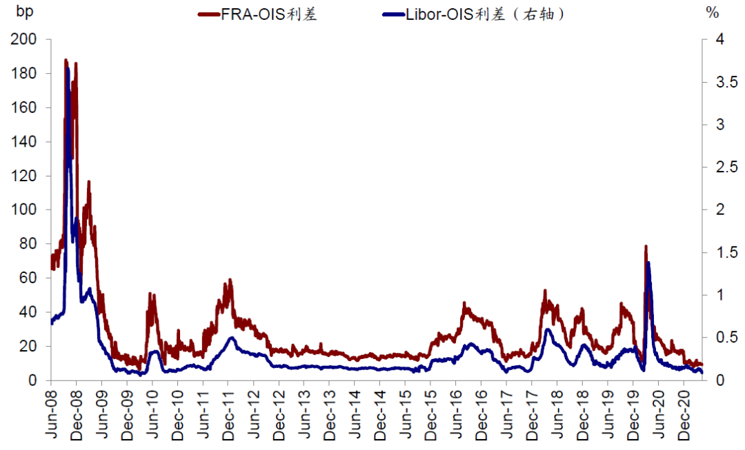2.Libor/FRA(Forward Rate Agreement)-OIS利差,主要用以衡量银行体系内部流动性状况,是银行等金融机构之间拆解的主要融资成本。