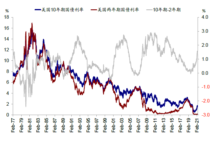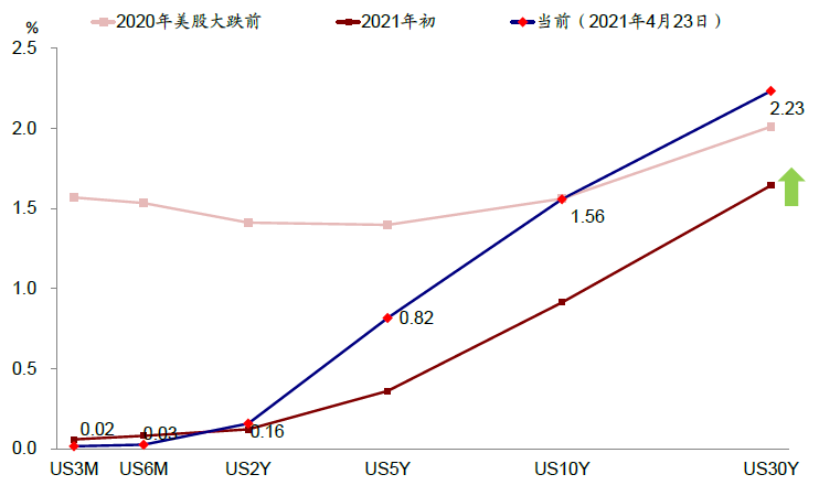 近期美债利率剧烈动荡主要是以长端利率为主,短端利率如2年期以下基本维持不变,这也使得美债收益率曲线持续陡峭化。