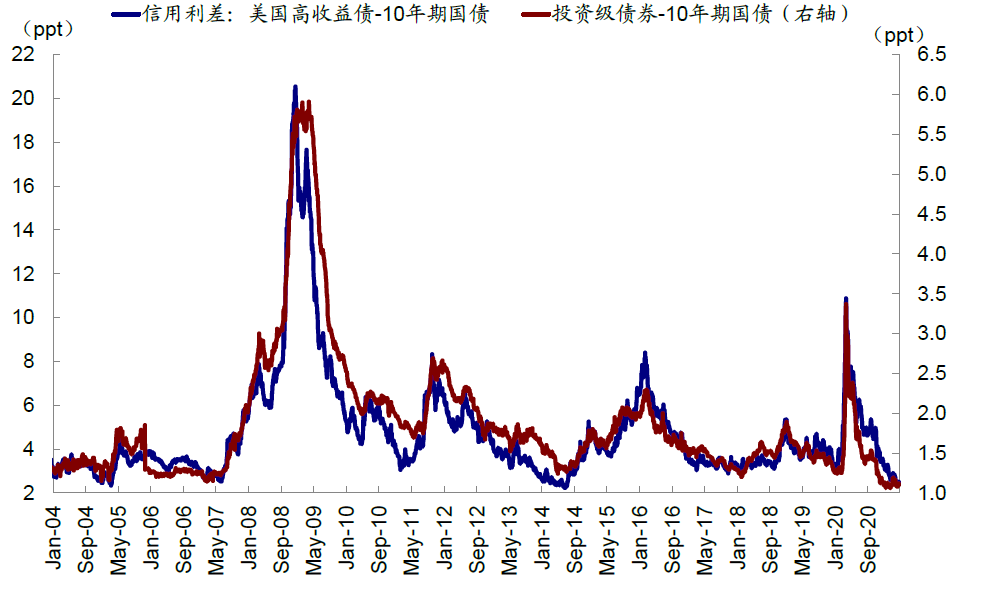 2.国债与信用债发行。国债与信用债发行既反映供给端的压力,例如美国新一轮财政刺激可能带来的新发国债需求,也能反映市场供求关系是否健康,例如在疫情期间,由于信用债市场的动荡,新发行一度冻结,严重影响了企业的正常融资需求,直到美联储决定直接购买信用债才逐渐稳定市场信心,使得信用债市场逐渐恢复正常,信用利差也得以大幅回落。