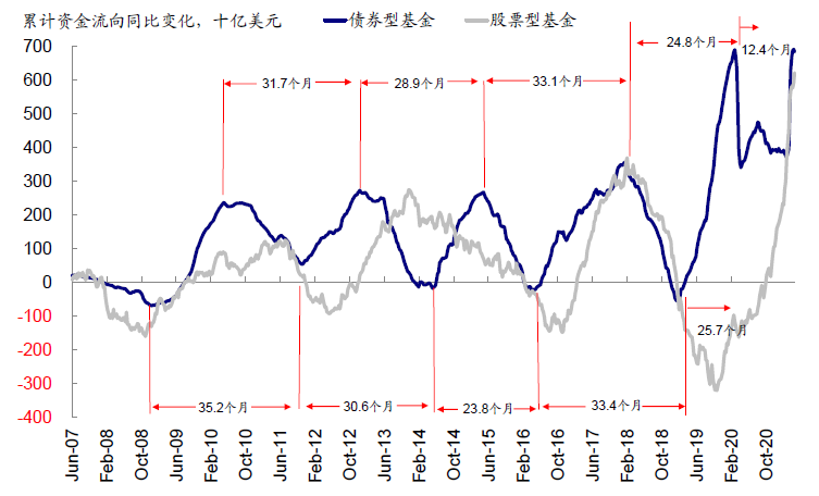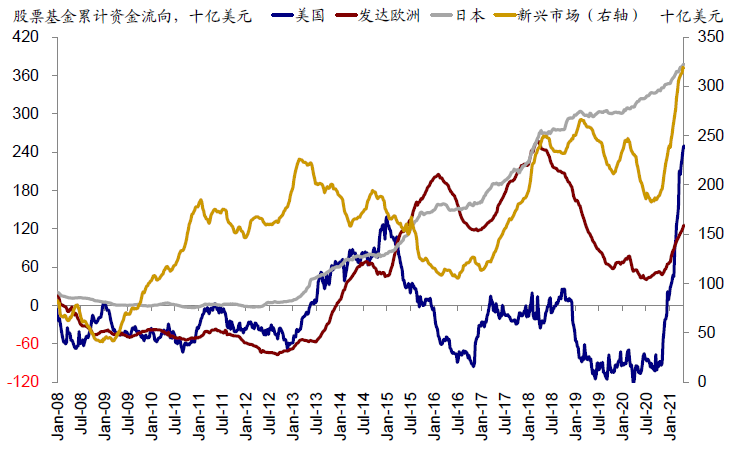 3.股债资金流向。从微观的股债市场资金流向角度,EPFR的数据显示,2020年10月之后,全球资金持续且大幅流入美股市场,幅度和规模均明显强于其他市场;与此同时,美债市场也继续流入,但速度明显趋缓,特别是美债利率大幅上行后。
