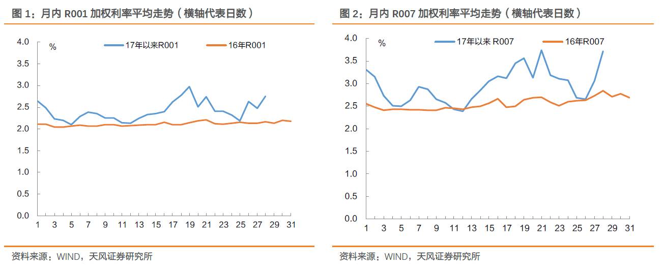 将16年每个月份资金利率平均走势与17年开年来3个月的走势均值做对比,使用R001或R007指标都会发现,资金面在20日前2-5个交易日开始资金利率明显走高,资金面相对紧张,而在20日、21日之后会有一波下行。相较而言,15-16年时这一现象并不明显,反倒是2015年之前这一现象更为明显。