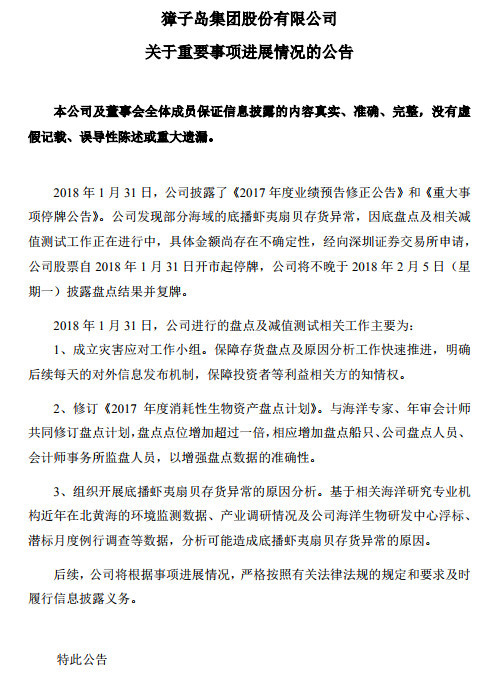 獐子岛今日早间发布重要事项进展公告称,公司发现部分海域的底播虾夷扇贝存货异常,因底盘点及相关减值测试工作正在进行中,具体金额尚存在不确定性,经向深圳证券交易所申请,公司股票自 2018年1月 31 日开市起停牌,公司将不晚于2018年2 月5 日披露盘点结果并复牌。